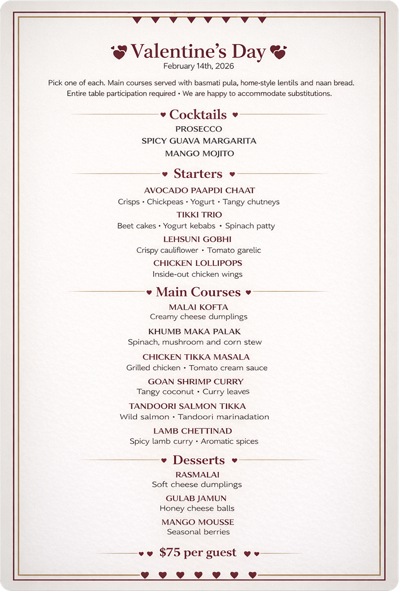 Anu and Navjot have always enjoyed cooking together, creating their own recipes, and using the recipes passed down from older generations. They always wanted to share their passion for the diverse flavors of Indian cuisine with others. Navjot and Anu are now able to share their love for Indian cuisine with their patrons